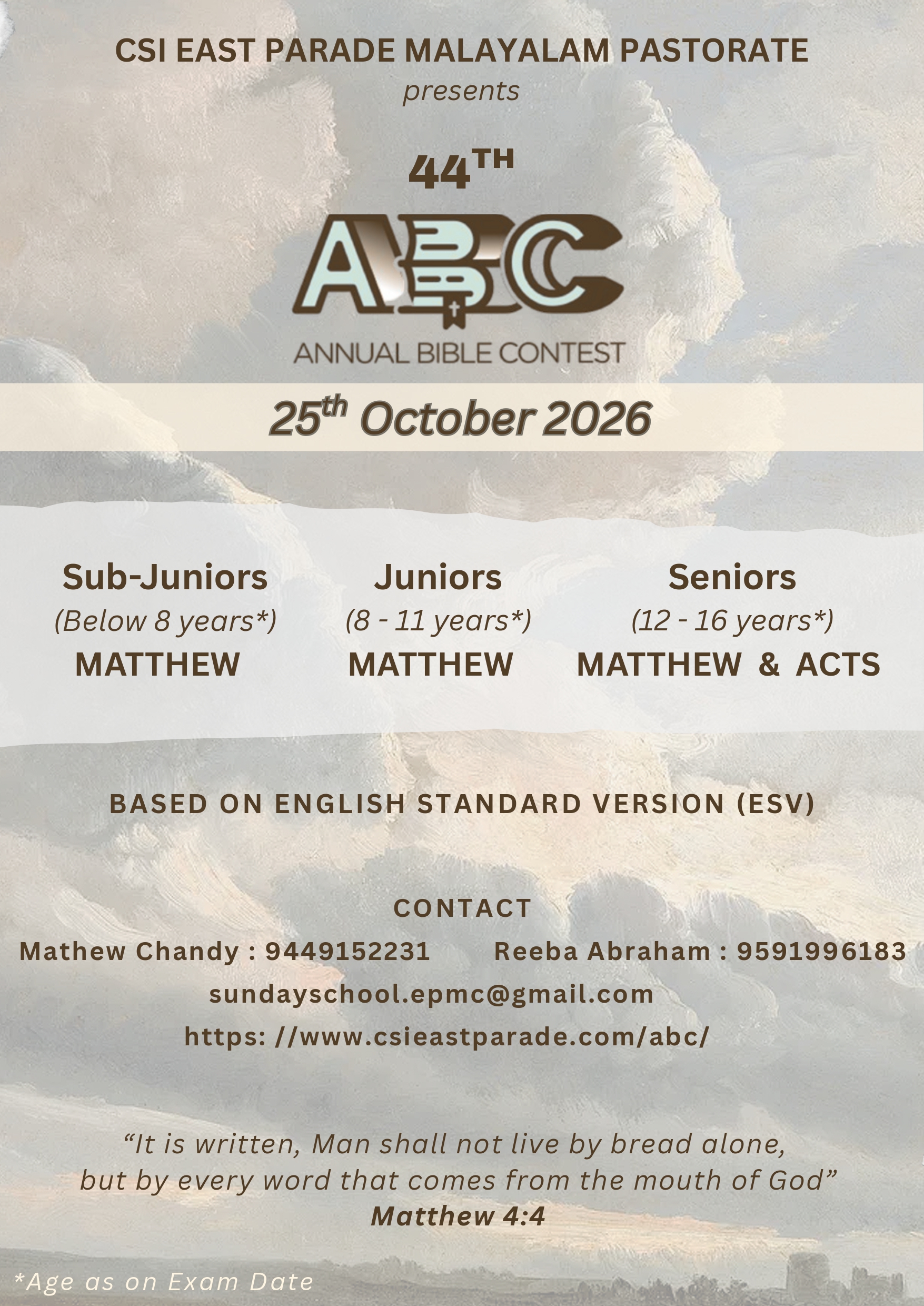 Held annually to encourage children to study Scripture with focus and discipline. The exam is based on selected portions announced in advance.